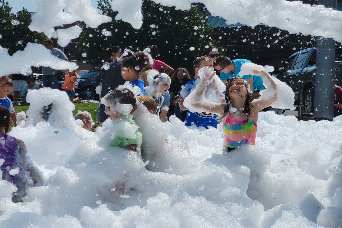 Foam billowed onto the front lawn of the Hopkinsville- Christian County Public Library Saturday morning as dozens of kids slipped and dove through the bubbles to celebrate the library’s successful summer reading program.