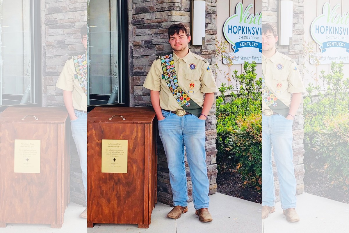 Mathew Burnham with Troop 3013 in Hopkinsville recently completed an Eagle Scout project that supplies the community with places to properly dispose of damaged or tattered American flags.
