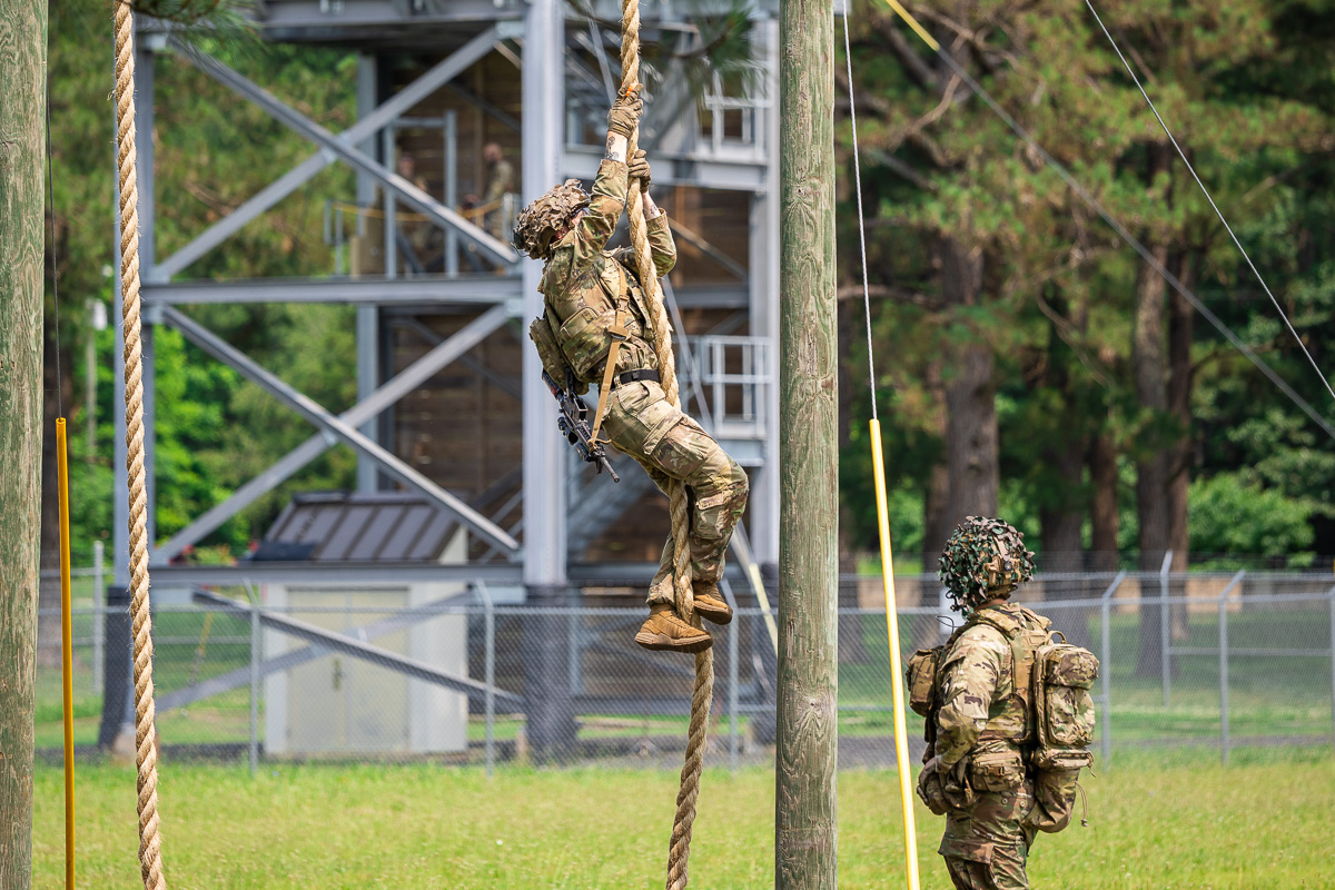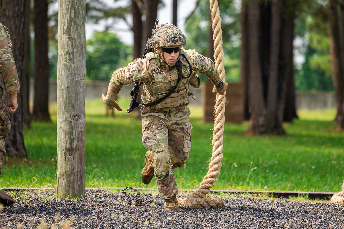 In addition to combatives, the stress shoot event pushed soldiers through a timed obstacle course designed to mimic combat conditions. The course began with short sprints, followed by a rope climb, and included stair runs, target shooting, sled pulls and wall climbs. Soldiers had to hit targets from different positions and platforms while wearing full gear and carrying their weapon. Missed shots added time penalties, increasing the pressure.