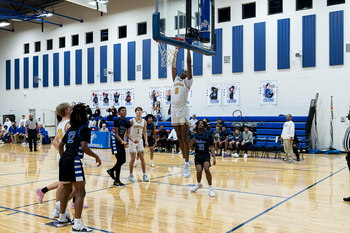 #5 Jaydarius Wilson of the Caldwell County Tigers with the dunk against the FCHS Falcons on January 8, 2025 (Jeff Danault)
