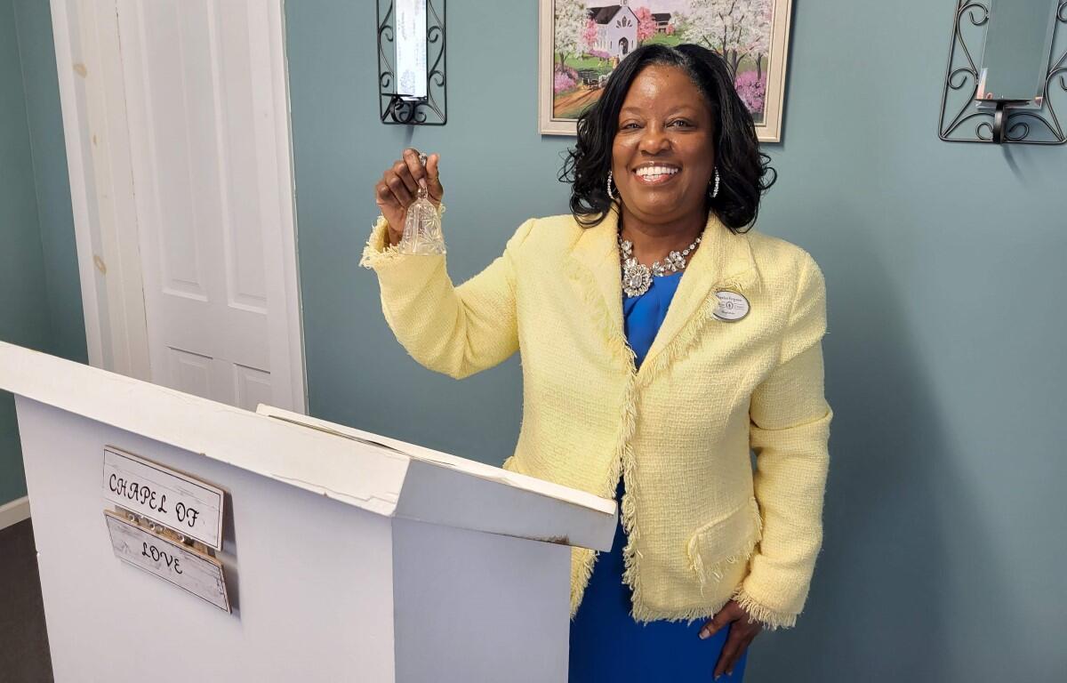 After performing 180 weddings in 2023, she still loves meeting new people from all walks of life and witnessing their happiest moments. When asked about her favorite part of the process, she silently walked over to her podium and began ringing a small crystal bell while a big grin spread across her face.