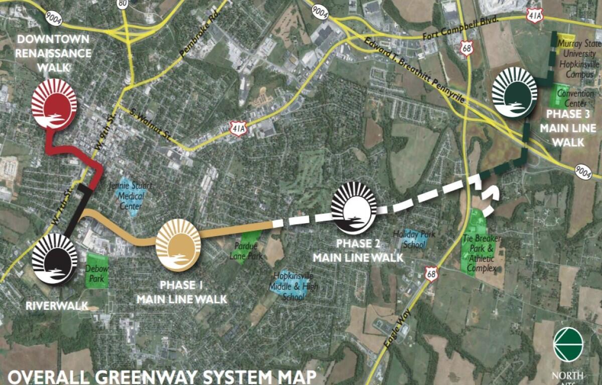 The Hopkinsville Greenway is a paved walking and biking trail system that began in 2001 when the Pennyrile Rail Trail Foundation was formed with the goal of utilizing the abandoned Fort Campbell rail spur as a walkable trail. Currently, the trail stretches from Riverwalk to Pardue Lane. This new addition would add additional mileage, ending the trail at Tie Breaker Park. Creating the trail in three phases has continually been the goal of the city since the Rail Trail’s inception.