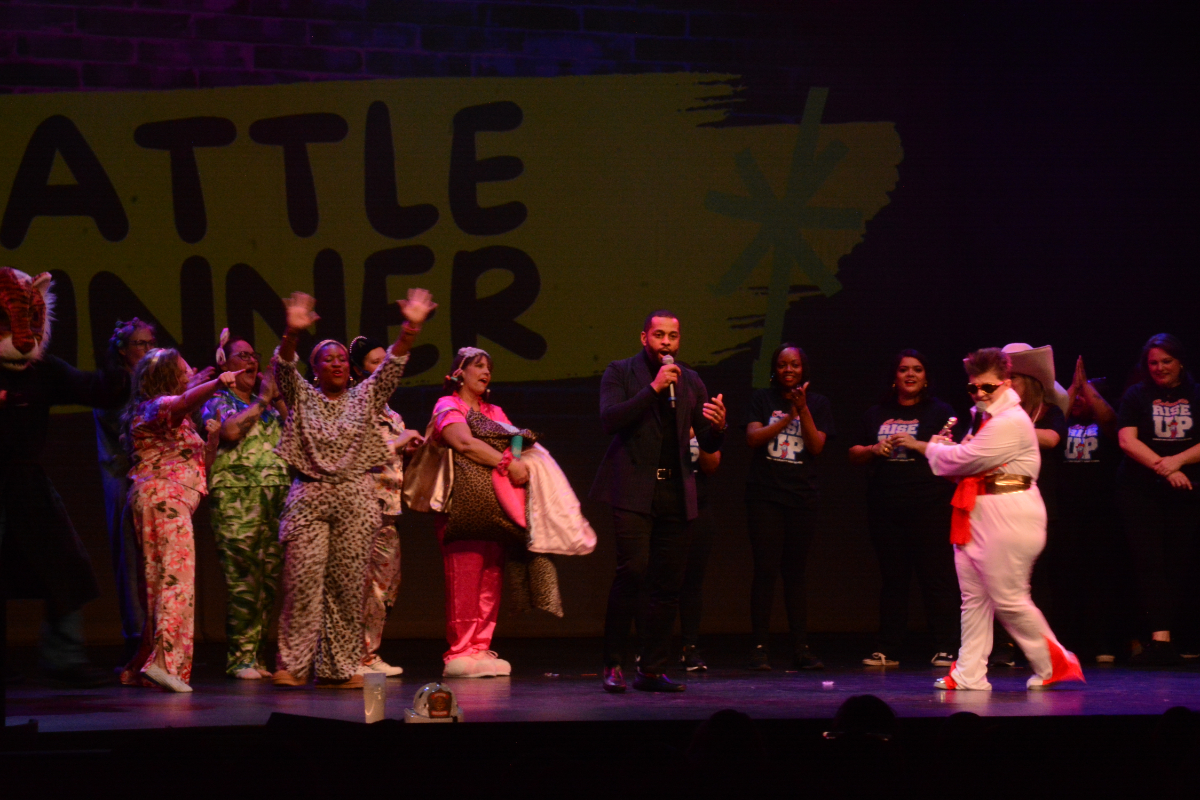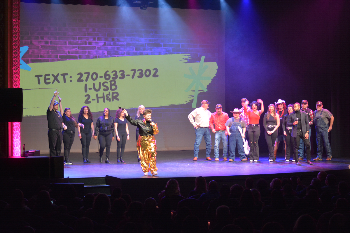 Will Owen and Becky Dearman hosted the evening and kept the theater laughing all night long. Attendees were able to vote from their phones at the end of each battle to pick a favorite. During the first battle, H&R Agri Power won over United Southern Bank with their honky-tonk beats.