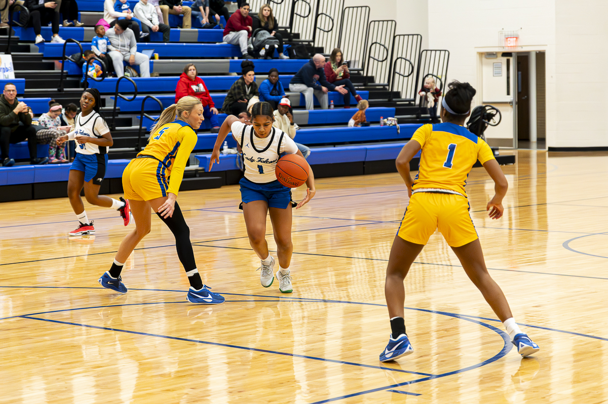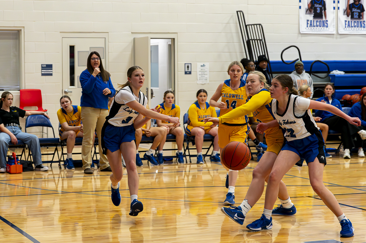 #3 Morgan Puckett of the FCHS Lady Falcons with the inside pass against the Caldwell County Tigers on January 8, 2025. (Jeff Danault)