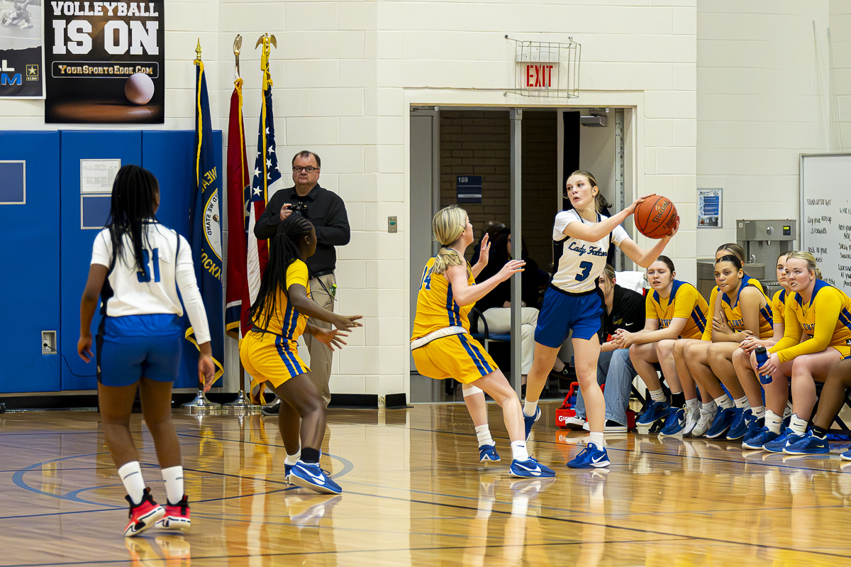 #3 Morgan Puckett of the FCHS Lady Falcons looks for a pass against the Caldwell County Tigers on January 8, 2025. (Jeff Danault)