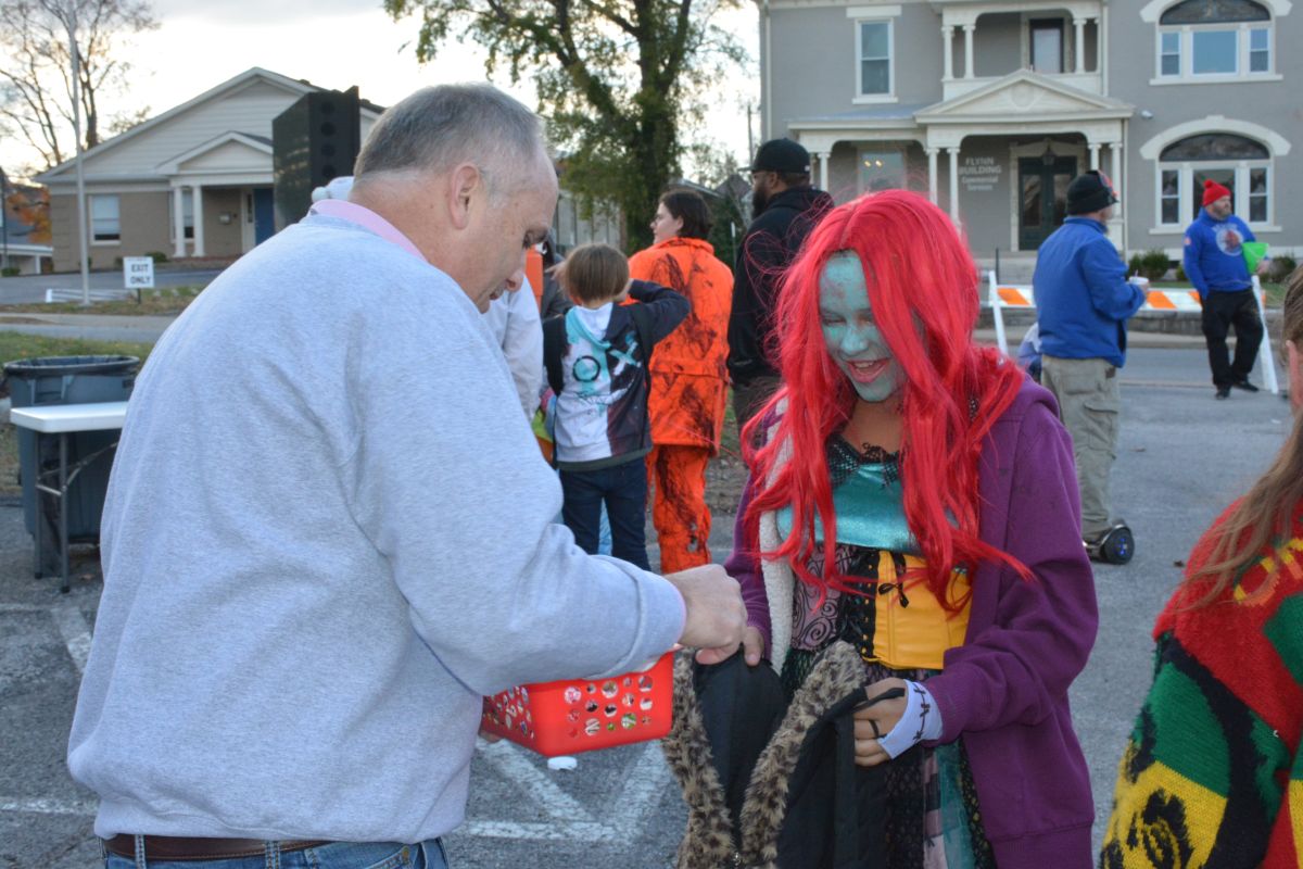 Hopkinsville Mayor James Knight was in downtown Hopkinsville with Trick or Treaters helping to fill their bags and buckets with goodies on Oct. 31, 2023. (Lee Erwin)