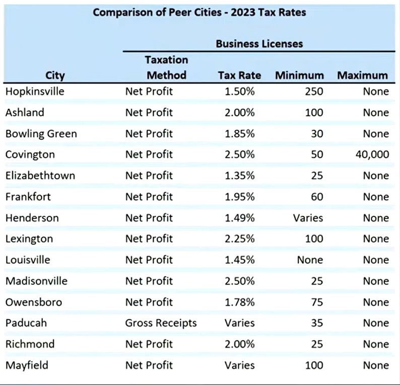 HOPKINSVILLE, KY (CHRISTIAN COUNTY NOW) – Hopkinsville may soon have the lowest net profit tax rate in the state as officials make the first move toward accepting a 1.3% rate. The Hopkinsville Committee of the Whole voted to move forward with this slightly lower rate after receiving pushback for initially denying the recommendation.