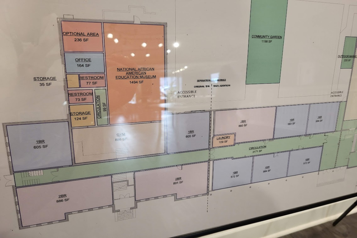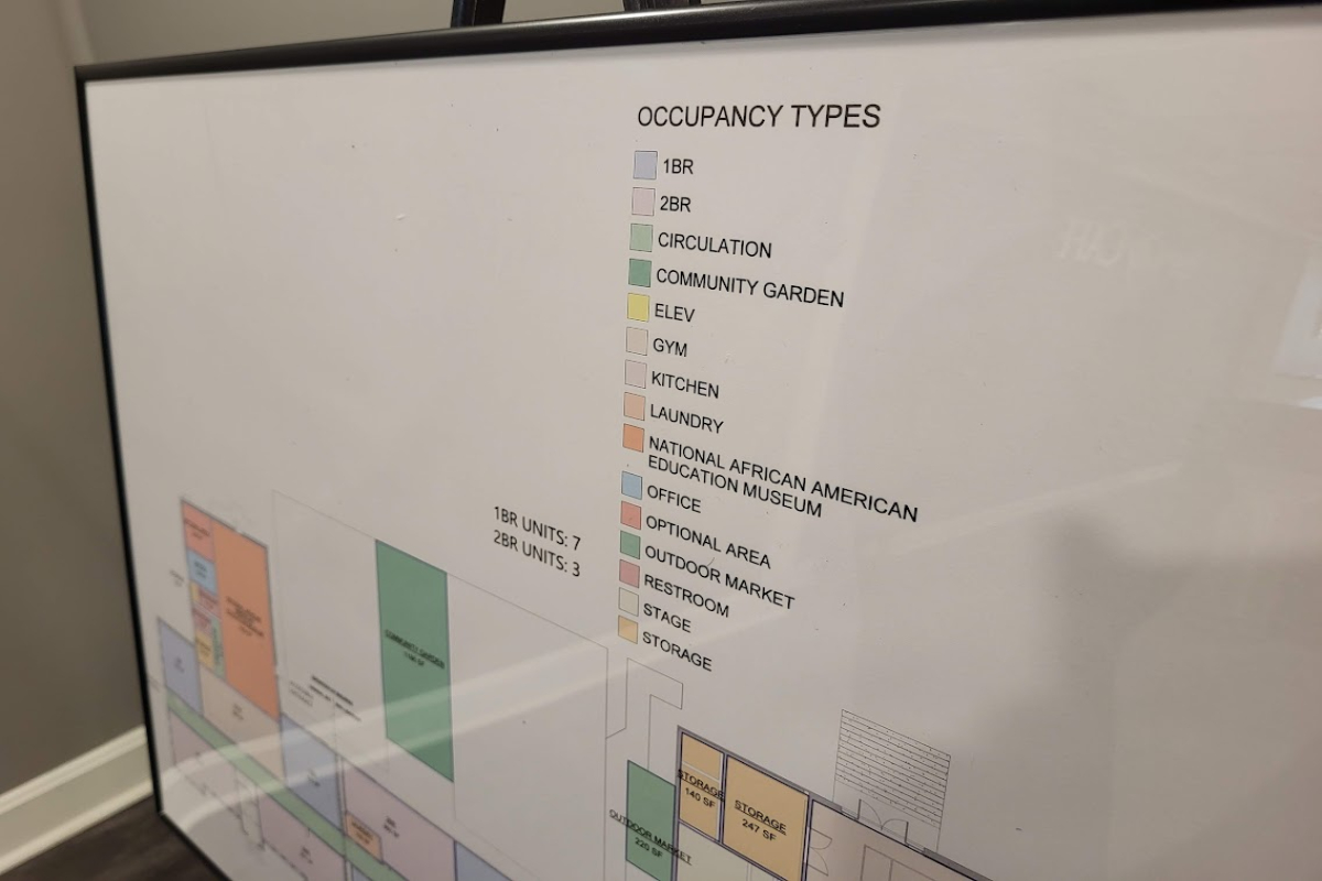A large community garden is the heart of the outdoor space, with a National African American Educational Museum housed inside. One and two-bedroom apartments cover both floors of the building, with 7,400 square feet of space going toward a state-of-the-art gymnasium.