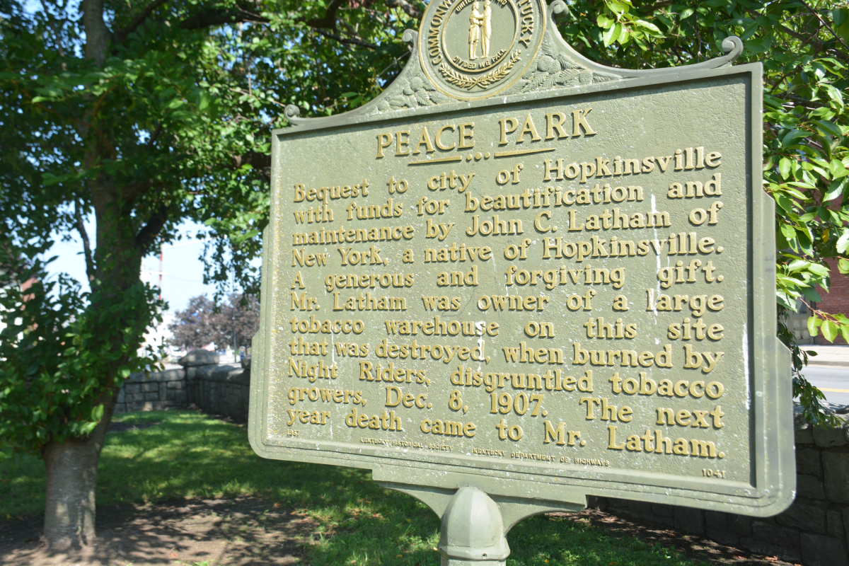 As the placard at the park explains, this location used to be home to a tobacco warehouse. On Dec. 8, 1908, it was burned down by a group of “disgruntled tobacco growers” called the Night Riders. This period of time was known as the Black Patch Tobacco Wars, and there were a lot of protests and violence surrounding it.