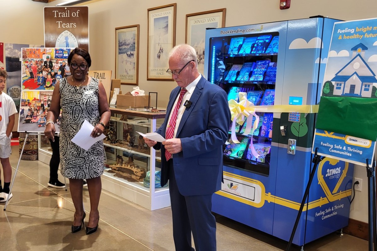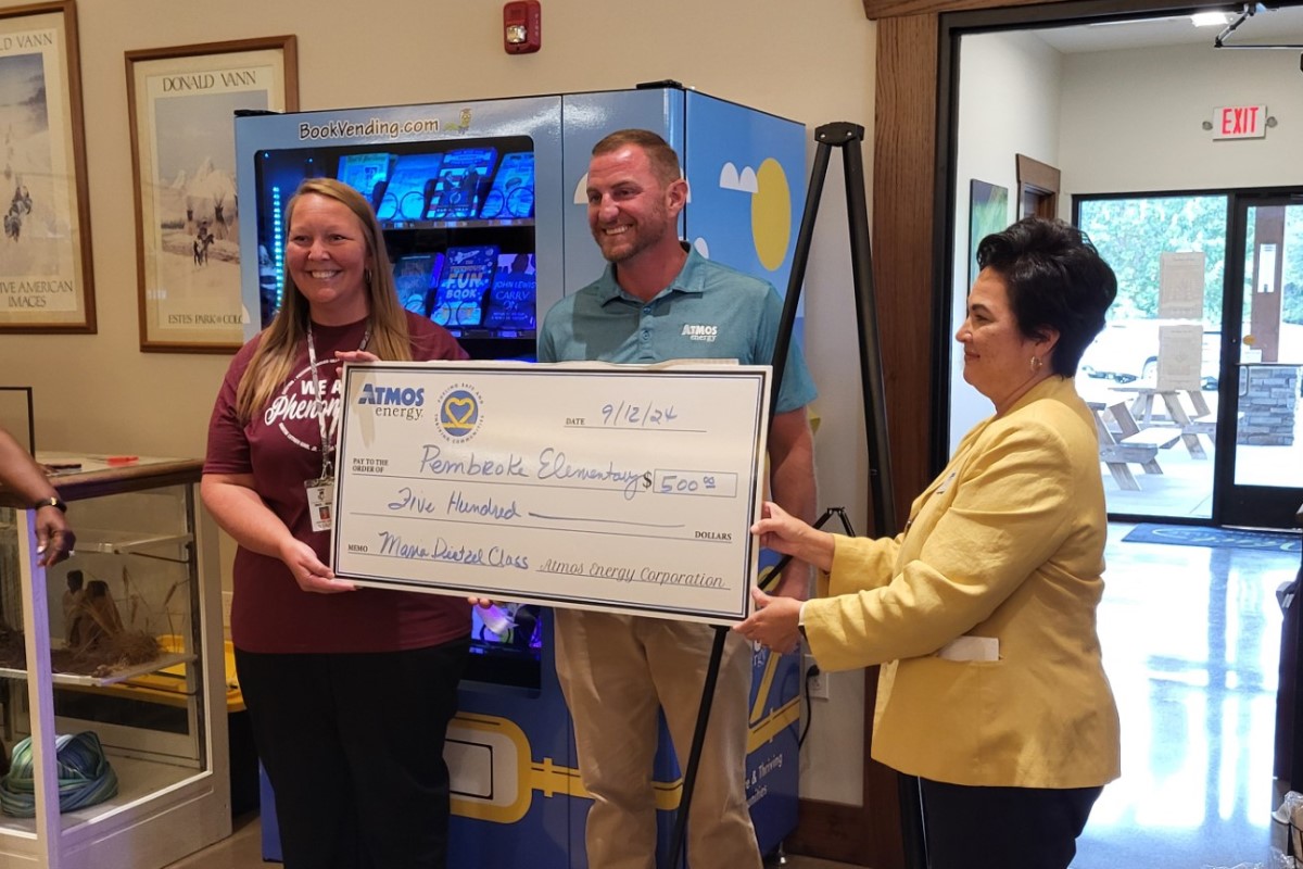 This vending machine was made possible due to a donation from Atmos Energy, who was present at the official ribbon cutting on Sept. 12. The vending machine’s official name is Literacy Launcher, which was decided through a naming contest held among local teachers. Maria Dietzel at Pembroke Elementary had the winning name, and received a $500 check for her class from Atmos.