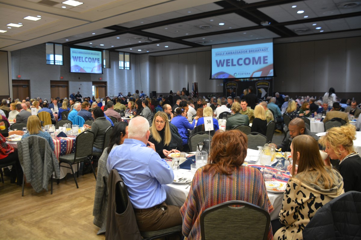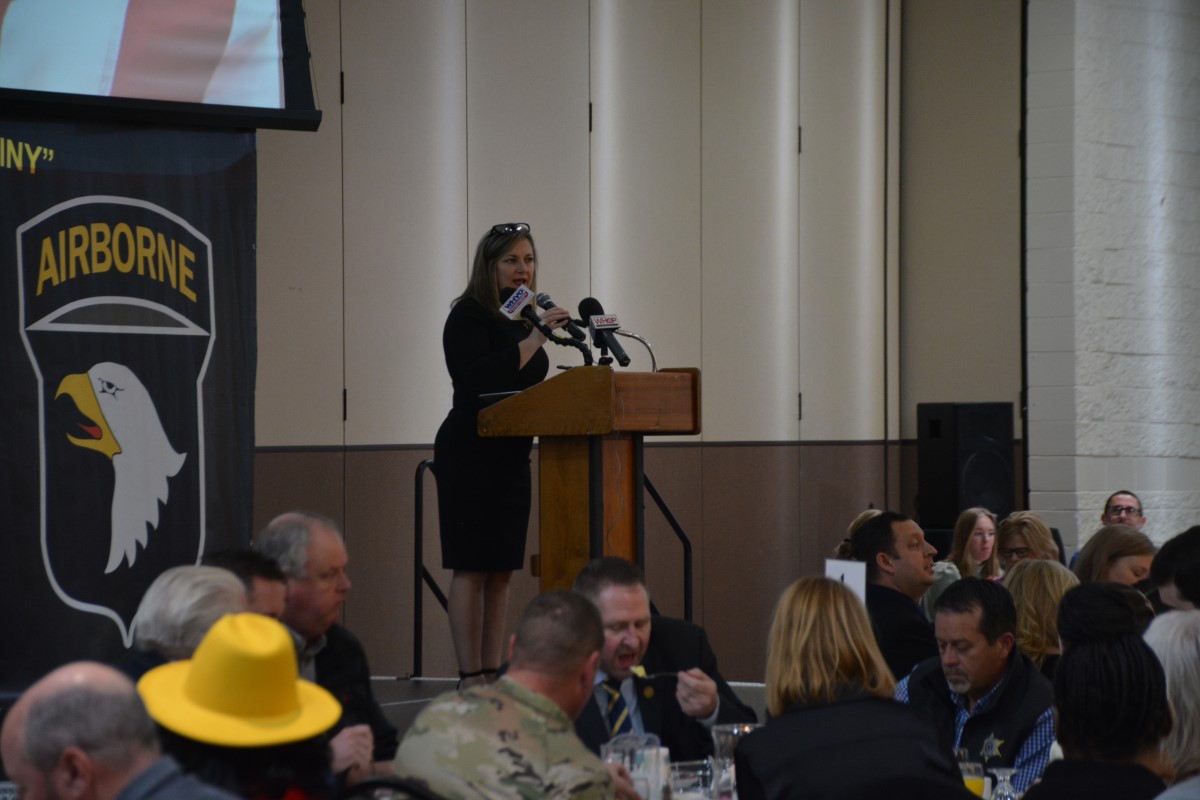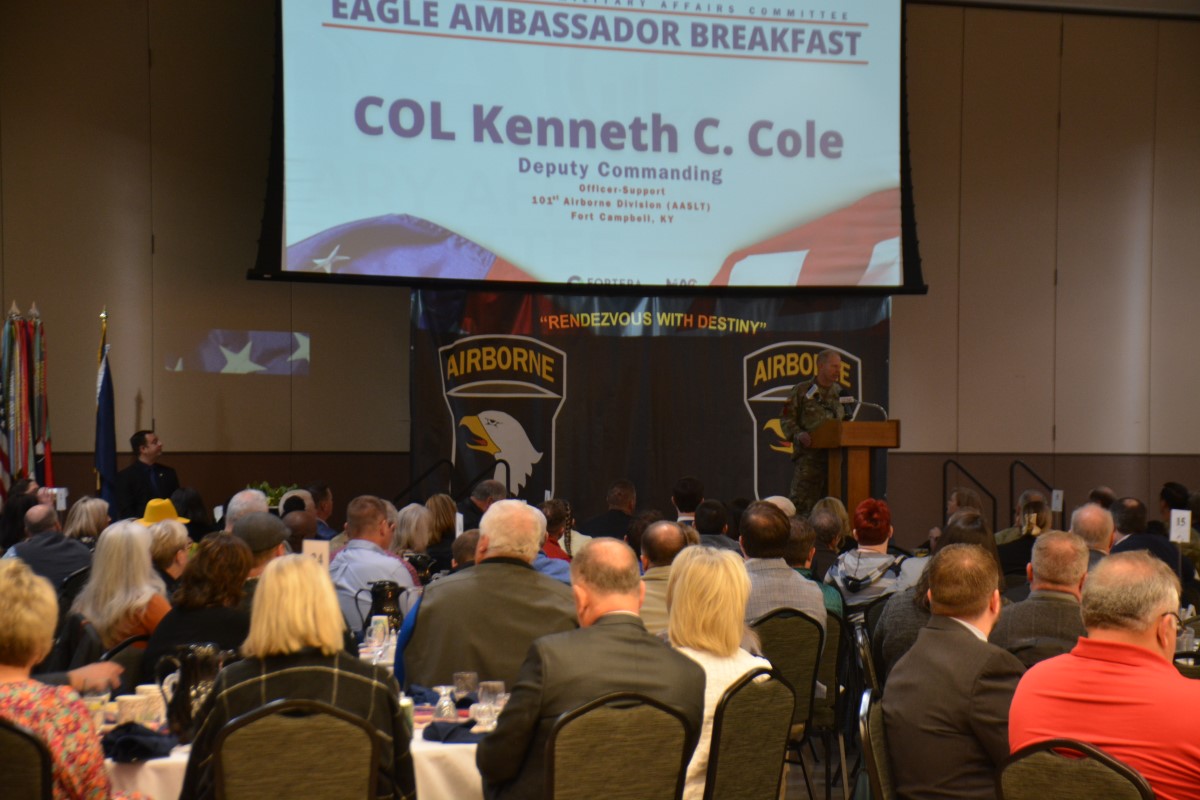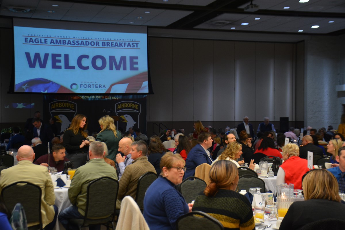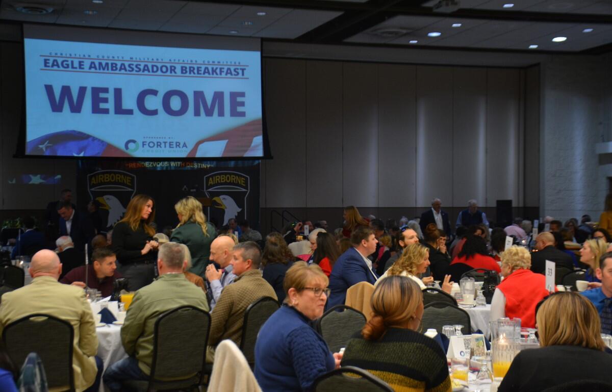 HOPKINSVILLE, KY (CHRISTIAN COUNTY NOW) – The Christian County Military Affairs Committee held their annual Eagle Ambassador Breakfast Thursday morning. Shannon Lane, the Director of Military Affairs said this was the largest crowd they’ve ever had for this event. Around 300 people enjoyed breakfast at The Bruce to watch the keynote speaker and celebrate the MAC’s accomplishments.