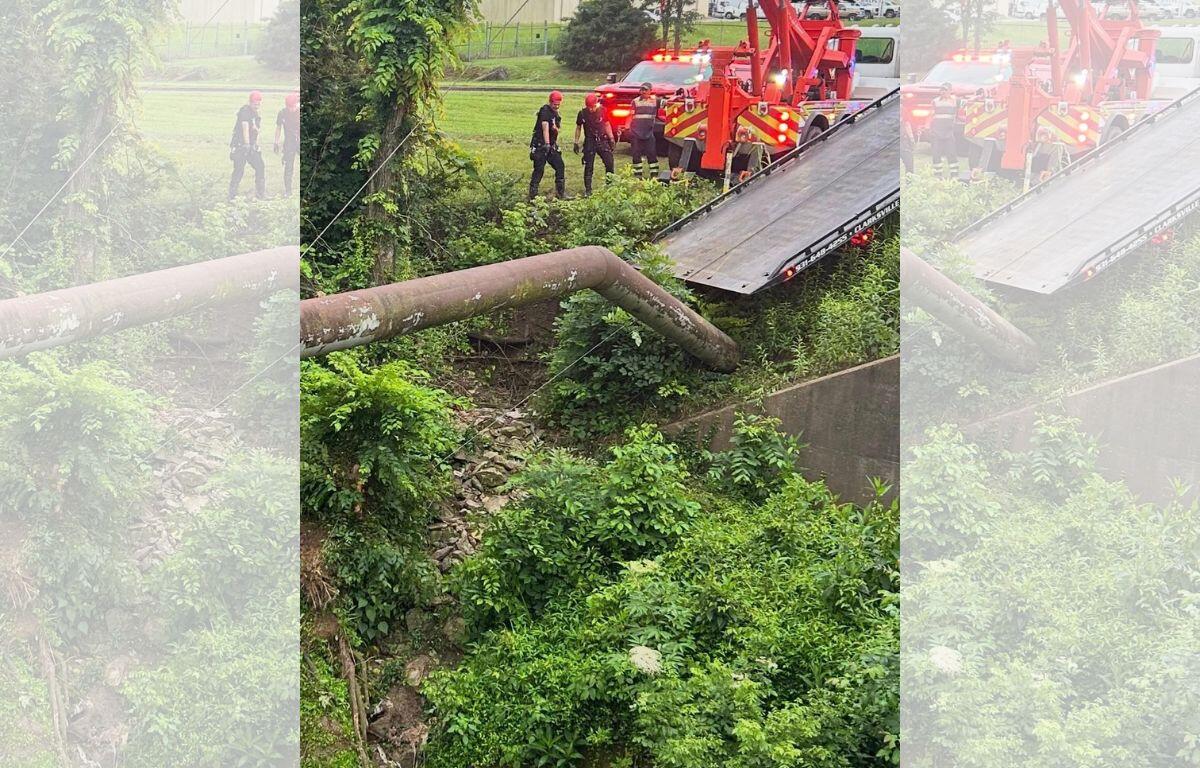 Upon arrival, HFD located the SUV around 50 feet below grade down the greenway embankment, just outside of the water. The vehicle was heavily damaged from the crash.