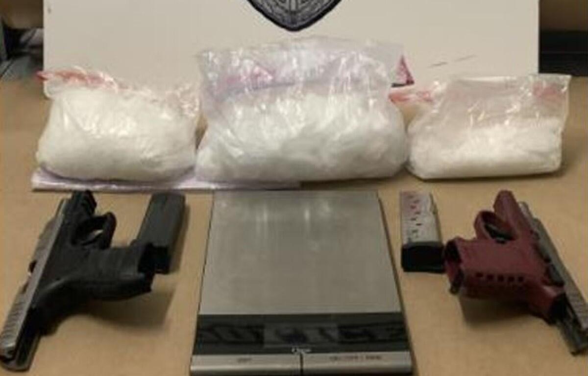 During the search, a significant amount of methamphetamine and two firearms were found. The man and woman at the residence were arrested and charged for trafficking.