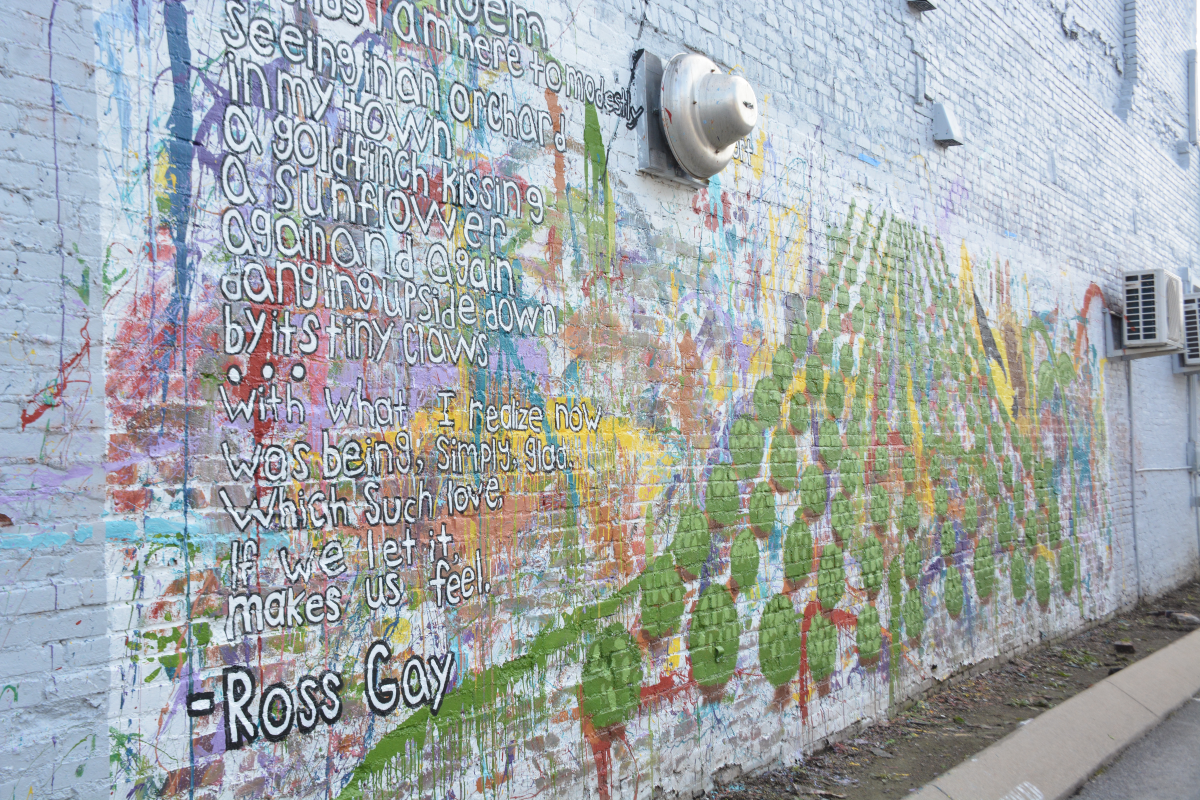 The design was inspired by the cover artwork on the book of poetry The Catalog of Unabashed Gratitude by Ross Gay, who also attended the ceremony. Molly Campbell from the Pennyroyal Arts Council led the dedication, and she introduced a few student artists, along with the head artist Jennifer Bowman. The mural features an excerpt from the book, and an artistic interpretation of the cover art.