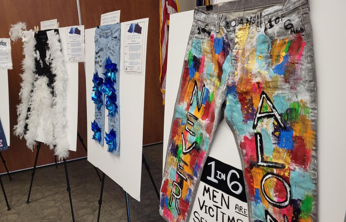 On April 22, Sanctuary Inc. held a reception for the Decorate Your Denim Jean Trail, where people were invited to view the jeans and hear more about the history of Denim Day. Womens, children’s, and men’s jeans were decorated by over a dozen organizations in the region. Zirconia Vansauwa said she was inspired by her love of fashion, and loved seeing organizations tap into their creativity to show support.