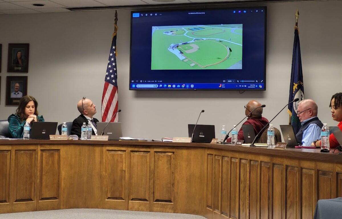 The large, grassy complex would be comprised of turf covered baseball and softball fields, a four-lane running track, practice soccer field, and tennis courts. Seating can be seen in the design along with stadium lights. The board voted to open bids for the project, estimated by Alliance Corporation to cost $7.5 million.