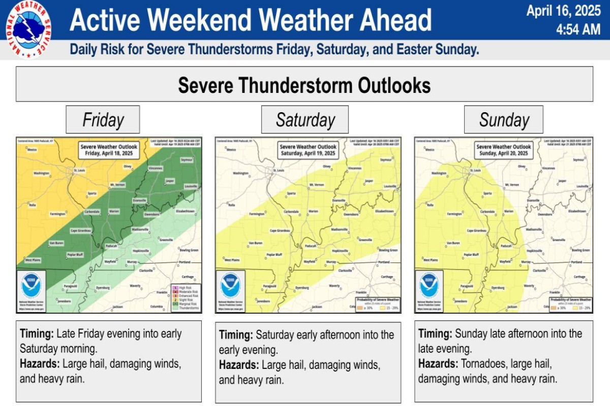 HOPKINSVILLE, KY (CHRISTIAN COUNTY NOW) – Beginning on Friday, severe storm chances for the region increase going into Easter weekend. On Friday and Saturday, large hail and damaging winds will be the main possible threats, with the tornado risk increasing on Sunday.