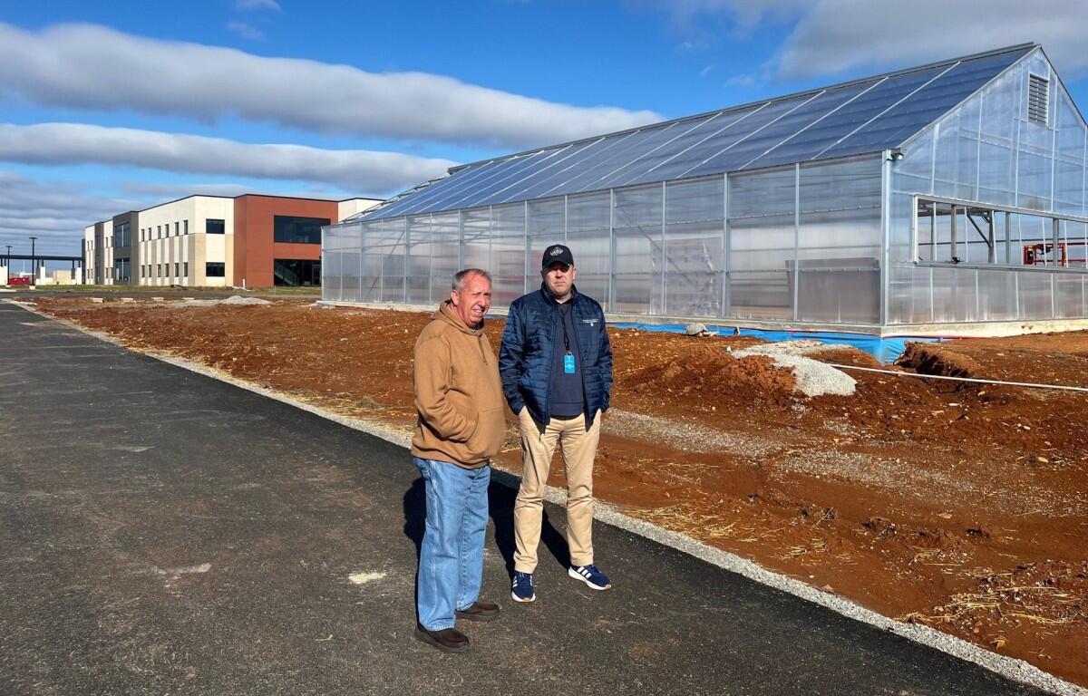 State Representative Myron Dossett is pictured with Superintendent Chris Bentzel in front of Christian County High School’s Greenhouse and new consolidated facility. (Contributed)