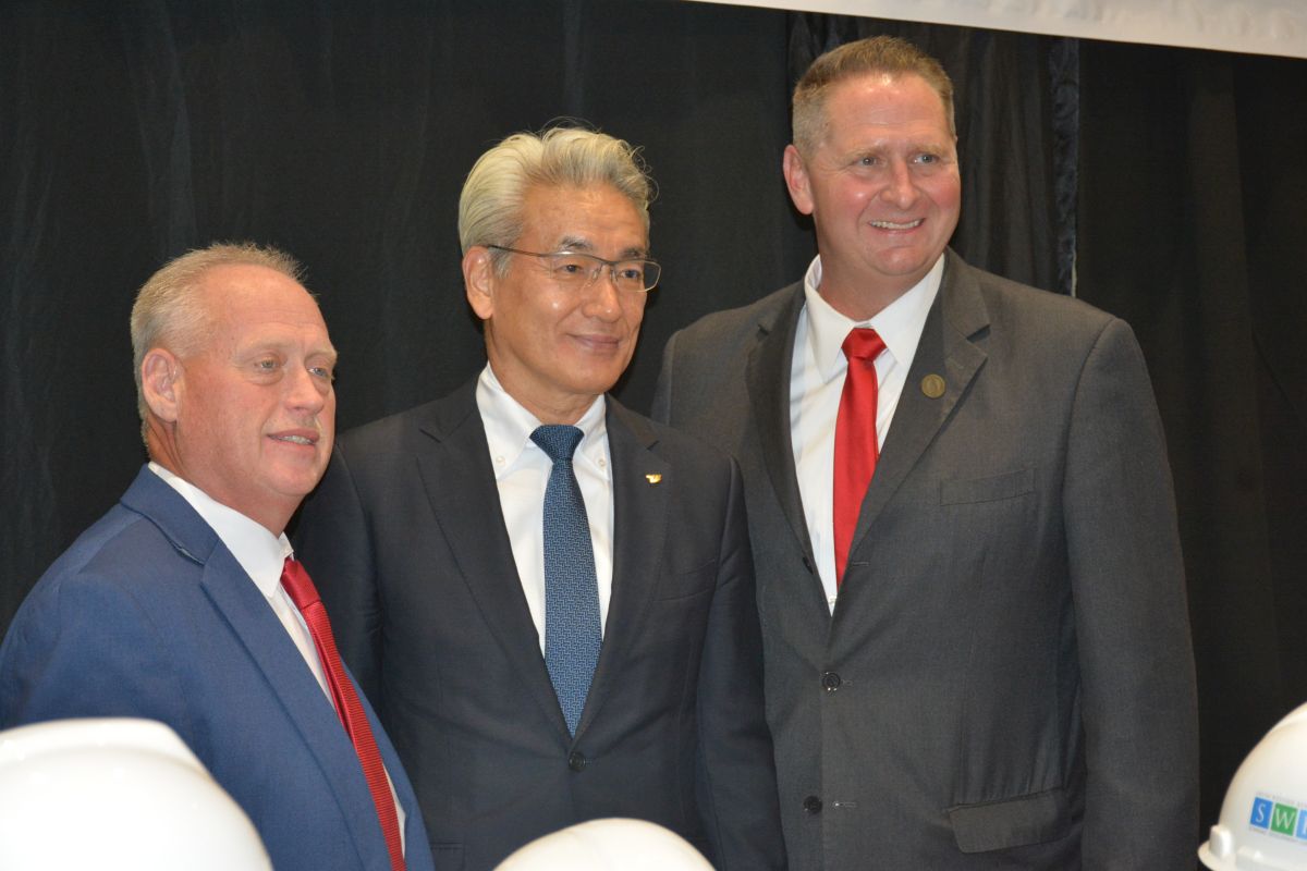 Mayor James Knight, Masayoshi Shirayanagi & Judge Executive Jerry Gilliam at the groundbreaking for the new Toyota Boshoku plant in Christian County on Oct. 4, 2023. (Lee Erwin)