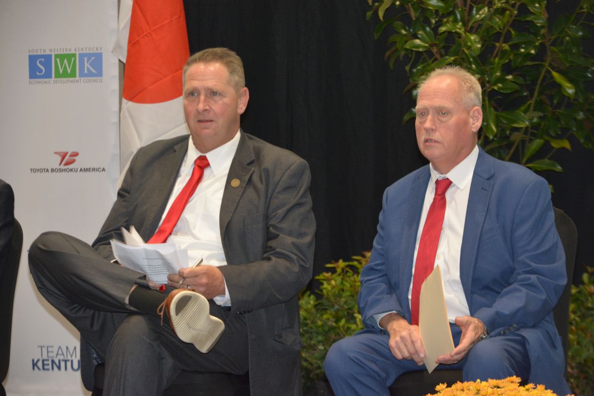 Judge Executive Jerry Gilliam and Mayor James Knight at the groundbreaking for the new Toyota Boshoku plant in Christian County on Oct. 4, 2023. (Lee Erwin)