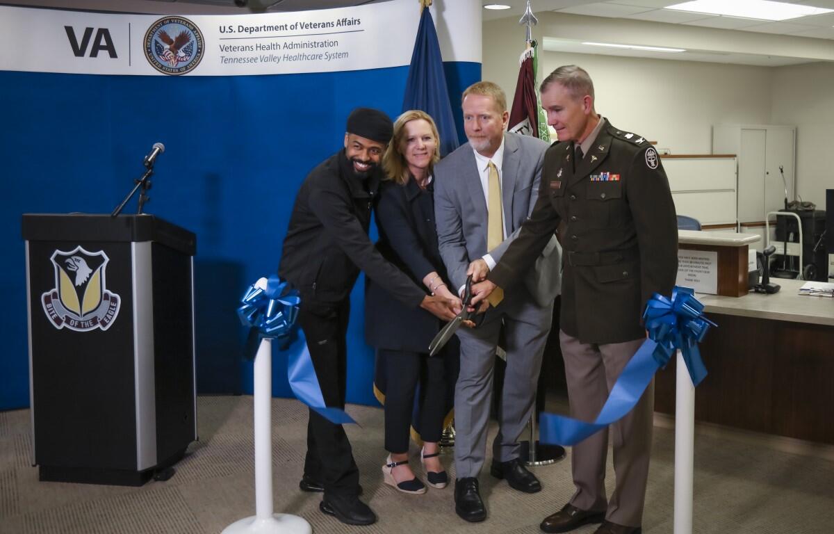 FORT CAMPBELL, KY – Daniel Dücker, Tennessee Valley Healthcare System executive director, Col. Jeffery Hambrice, U.S. Army Dental Health Activity-Fort Campbell commander, Dr. Donna Walls, TVHS chief of dental services, and Dr. Kennedy Germany, TVHS Dental Clinic local area supervisor, cut the ribbon to mark the official opening of the Taylor VA Dental Clinic on Fort Campbell Wednesday, June 12.